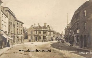 View east through the Market Place, Warminster, circa 1908. The General Post Office is centre of the picture with East Street to the right of it. The Old Bell Hotel on the far right of the photo.