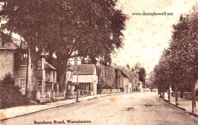 A view west along Boreham Road, Warminster, as depicted on a postcard posted in 1916. The Beeches on the left. The walls and railings of the Non-Conformist Cemetery are on the right.
