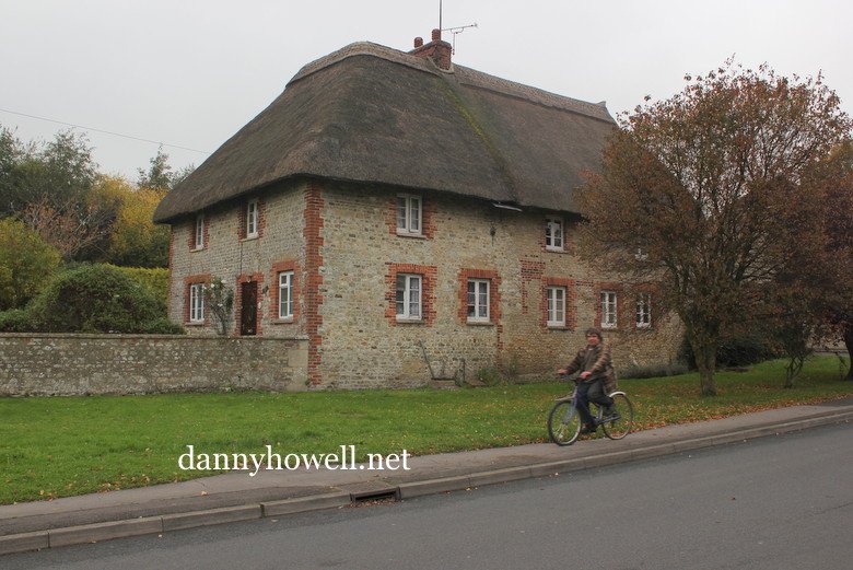 Nos.147 and 149 Boreham Road, Warminster (situated up from Boreham Crossroads at Woodcock Road) photographed by Danny Howell on the afternoon of Wednesday 24th October 2012. One of only two properties in Warminster with a thatched roof. Richard Dombkowski is riding by on his bicycle.
