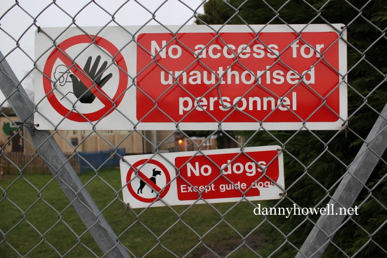 Signs on the gate state “No access for unauthorised personel” and No dogs except guide dogs.”