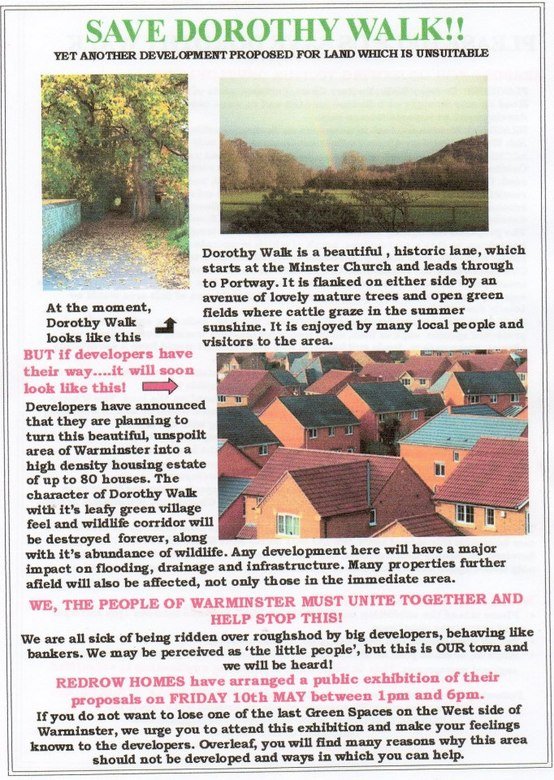 “Save Dorothy Walk. Yet another development proposed for land which is unsuitable. Dorothy Walk is a beautiful, historic lane, which starts at the Minster Church and leads through to Portway. It is flanked on either side by an avenue of lovely mature trees and open grass fields, where cattle graze in the summer sunshine. It is enjoyed by many local people and visitors to the area. Developers have announced that they are going to turn this beautiful, unspoilt area of Warminster into a high density housing estate of up to 80 houses. The character of Dorothy Walk with its leafy green village feel and wildlife corridor will be destroyed forever, along with its abundance of wildlife. Any development here will have a major impact on flooding, drainage and infrastructure. Many properties further afield will also be affected, not only those in the immediate area. We, the people of Warminster, must unite together and help stop this! We are are all sick of being ridden over roughshot by big developers, behaving like bankers. We may be perceived as ‘the little people’, but this is OUR town and we will be heard! Redrow Homes have arranged a public exhibition of their proposals on Friday 10th May between 1 pm and 6 pm. If you do not want to lose one of the last green spaces on the west side of Warminster, we urge you to attend this exhibition and make your feelings known to the developers.”