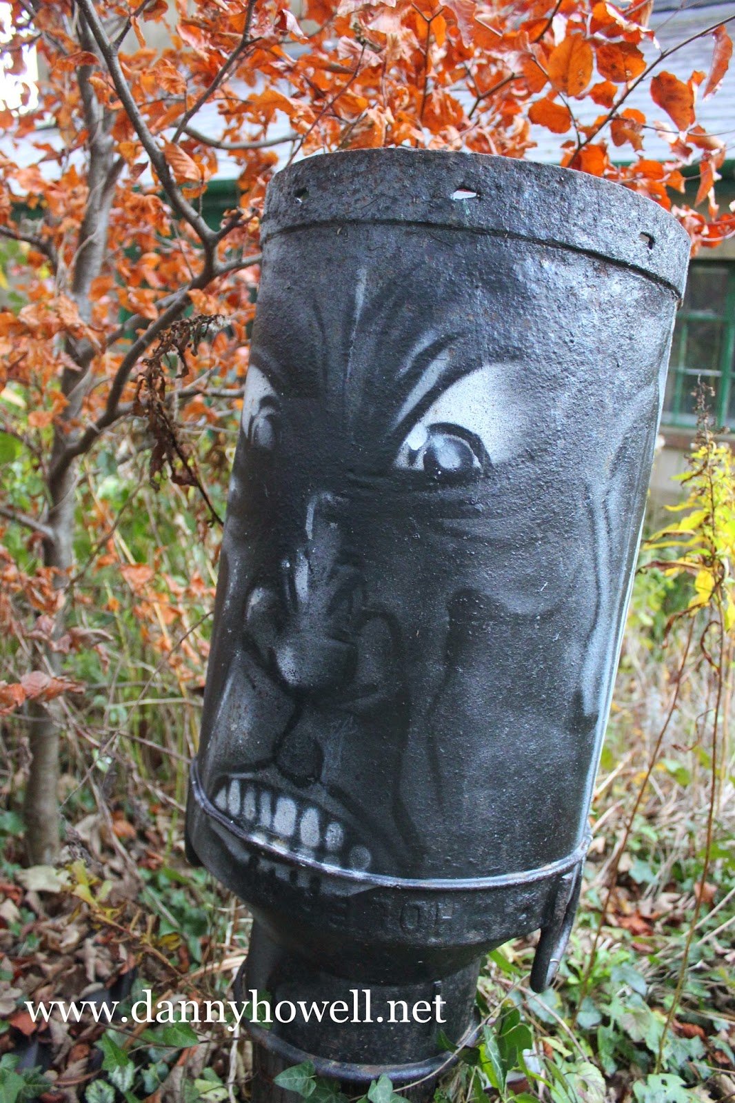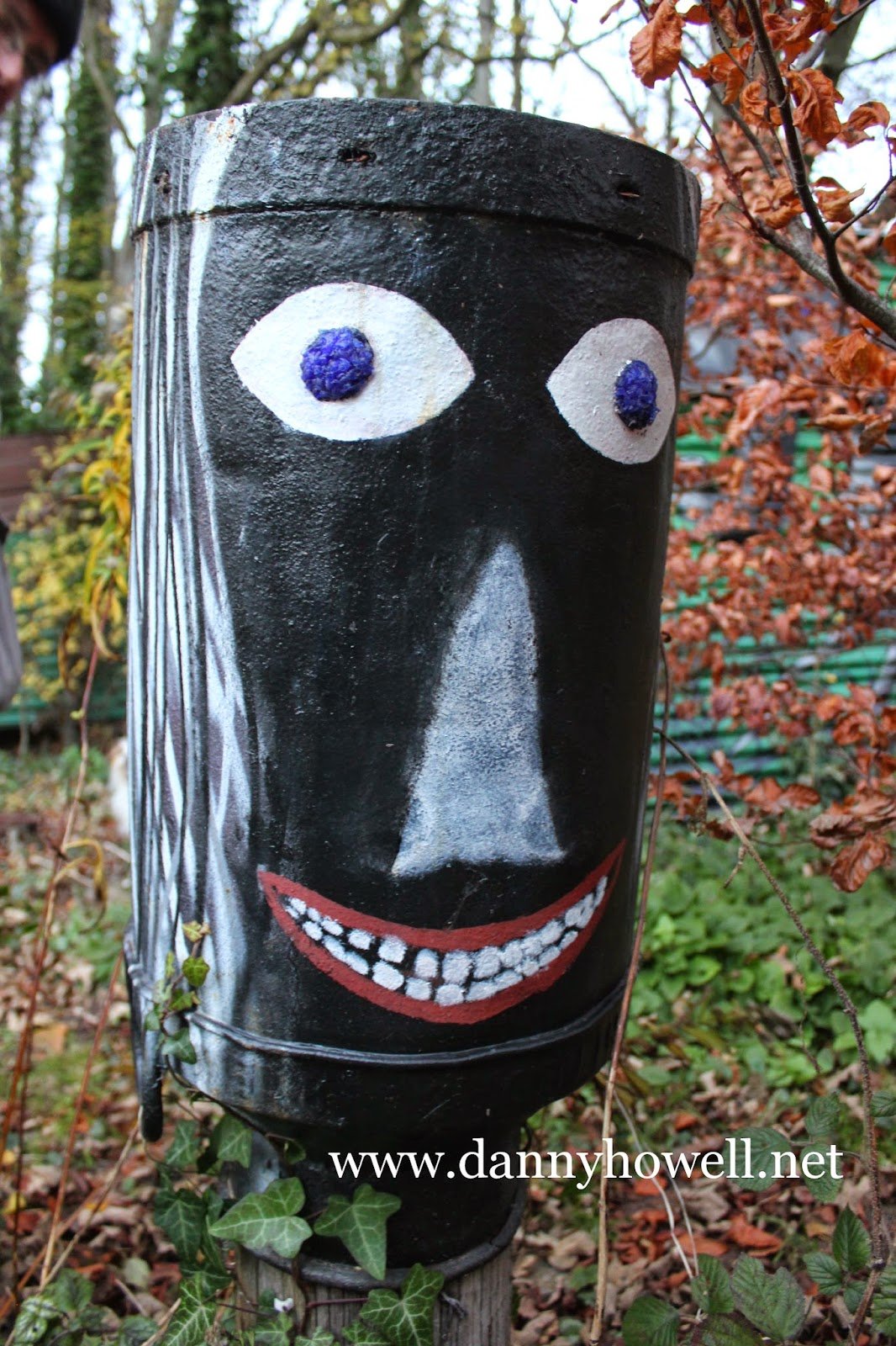 One of the faces of Janus, painted on an upturned churn (an installation by Scraptors’ Sculptors) at Bunters, Heytesbury.