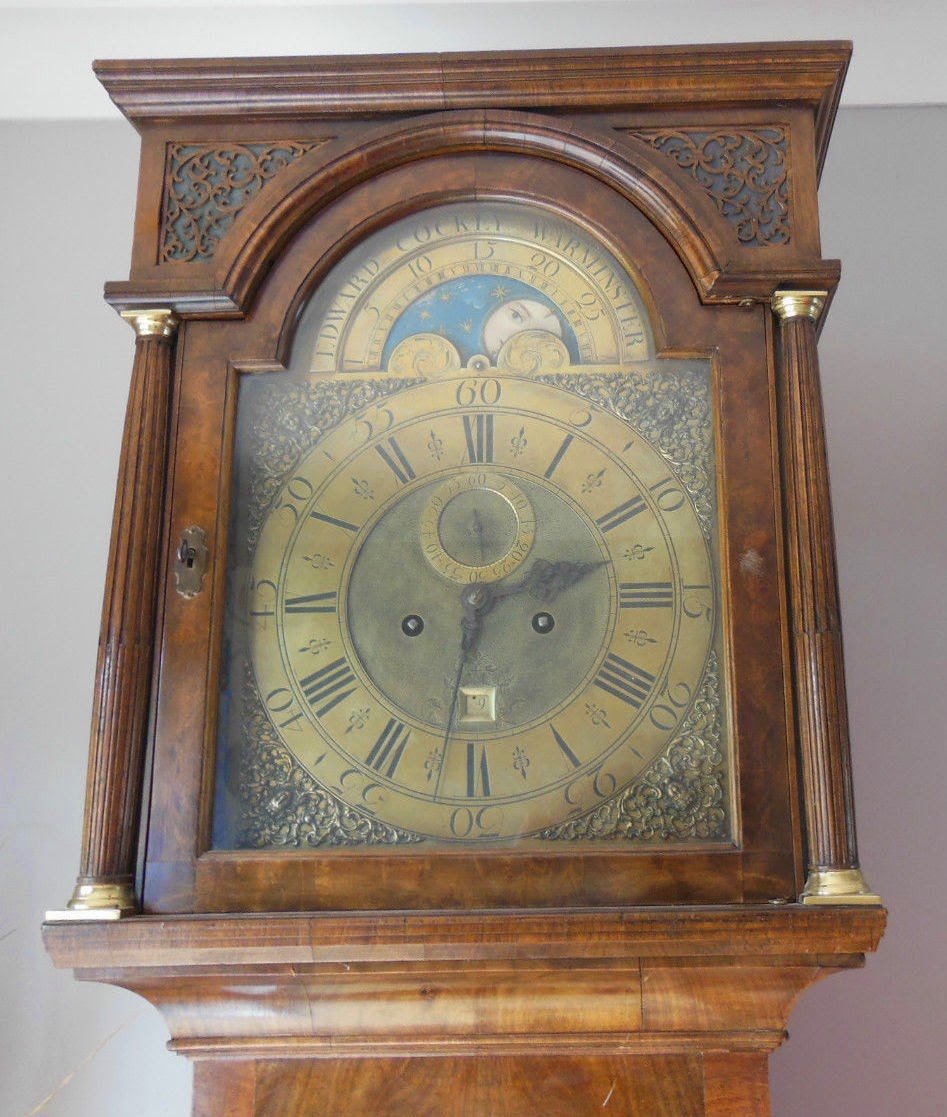A longcase clock made by Edward Cockey of Warminster sold on eBay on Saturday (12th July 2014) for £2,550. Up for auction, the clock, mistakenly listed by the seller as being the work of Edward Corkey, was described as being in “an oak case with a mahogany veneer, 7 feet 2 inches high; keys for the case but no key for the clock, some scratches and marks over the body of the clock.”