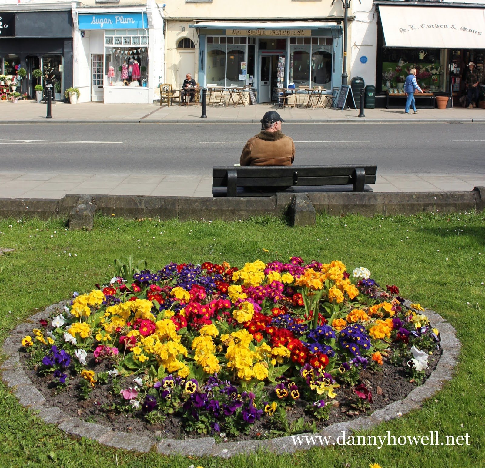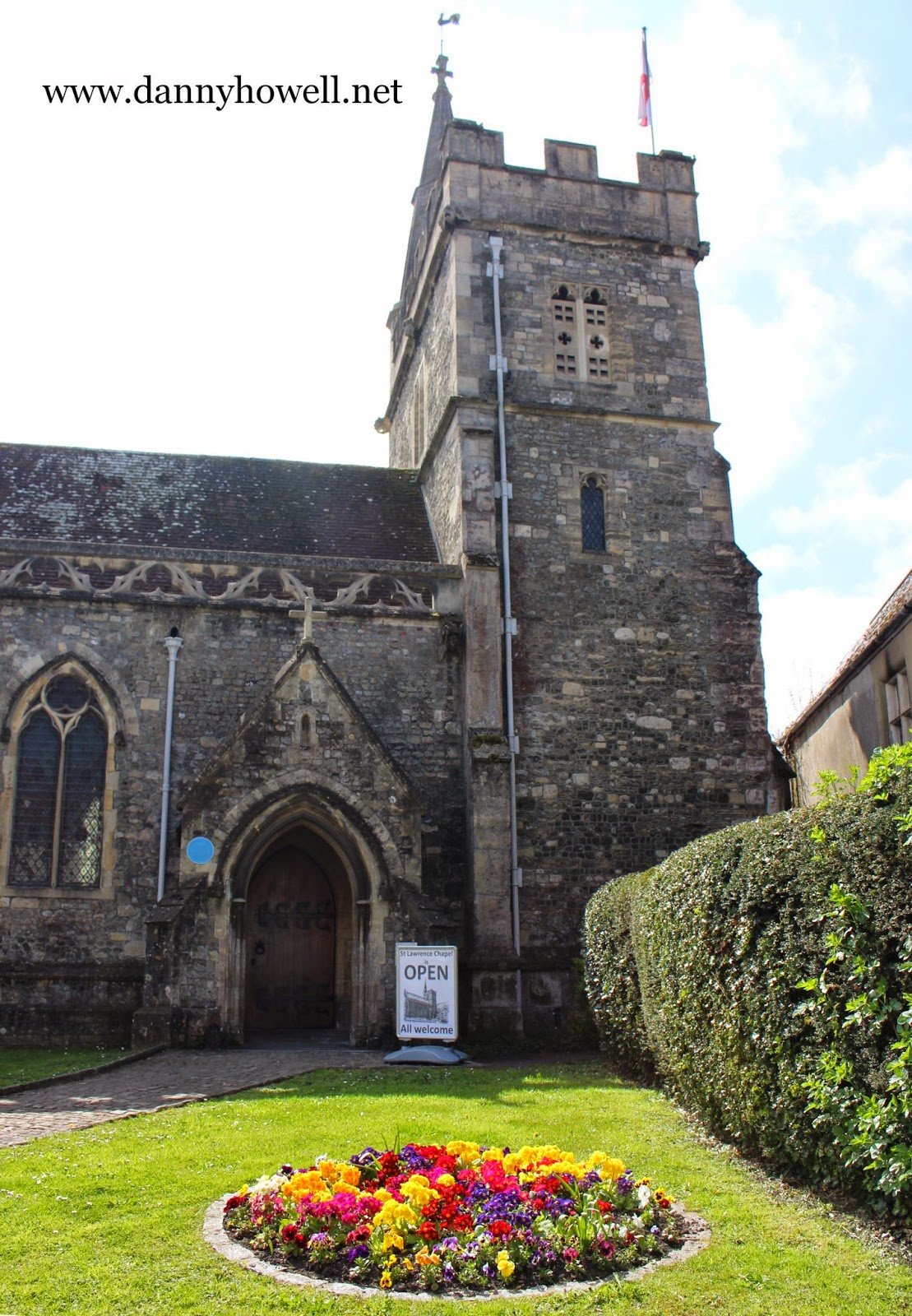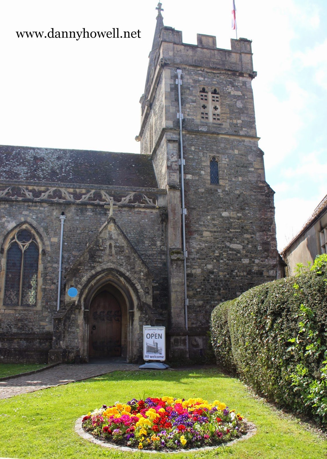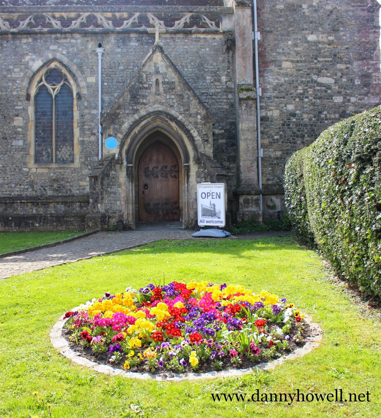 Flowers in the circular border in front of The Chapel of St. Lawrence, High Street, Warminster.