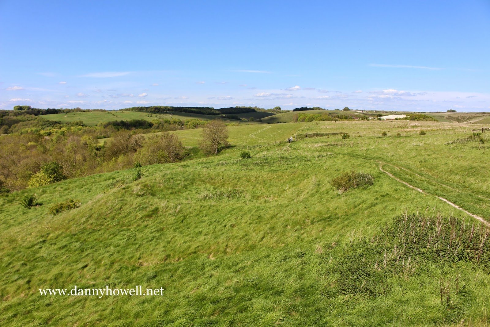 The raised depression in the turf (in the centre of this picture) is the dew pond on the west side of Battlesbury Hill, Warminster. Photograph taken by Danny Howell on Wednesday 13th May 2015.