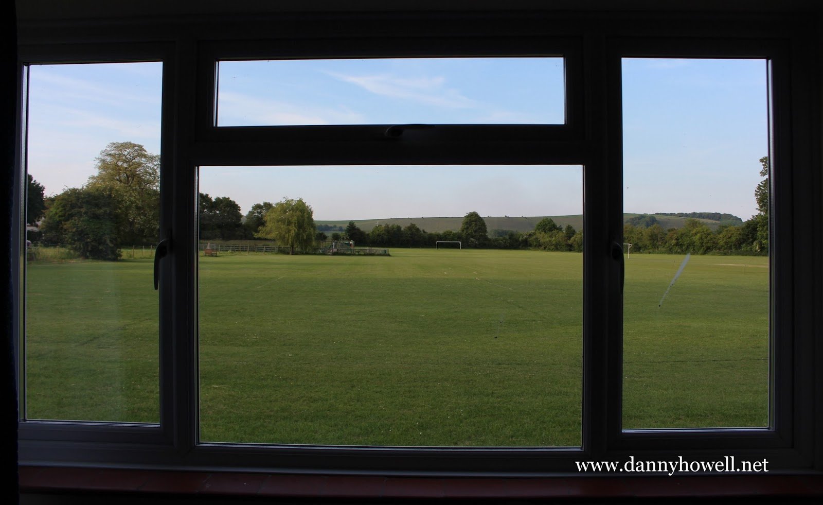 The Alexander Memorial Field, seen through a window at the Village Hall, Sutton Veny. Cotley Hill, Heytesbury, in the distance. Photograph taken by Danny Howell on Thursday 11th June 2015.