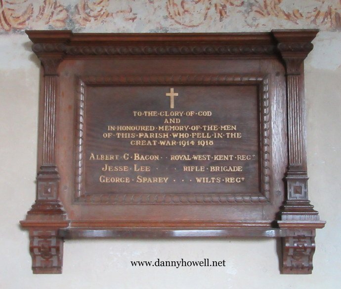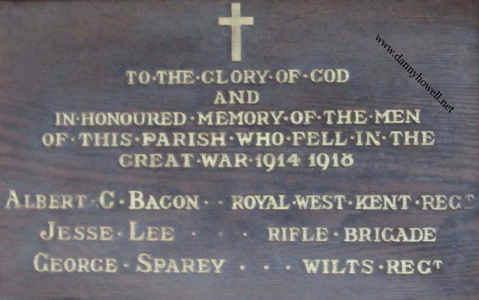 “To the glory of God and in honoured memory of the men of this parish who fell in the Great War 1914 1918. Albert C. Bacon . . Royal West Kent Regt.