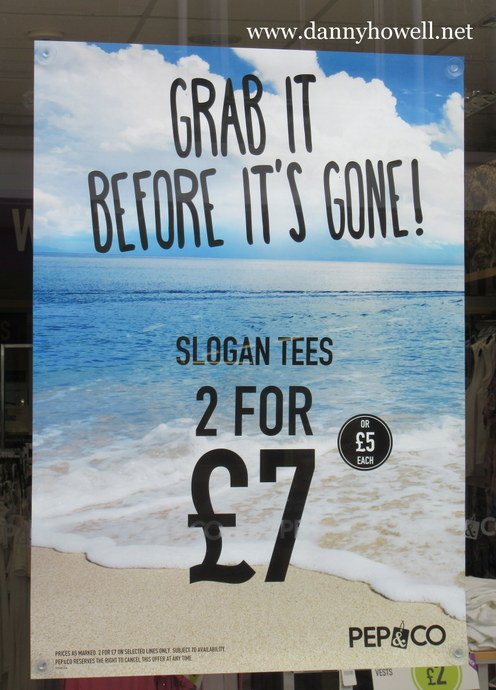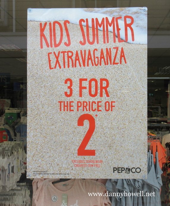 Pep & Co., Warminster Tuesday 23rd May 2017 Pep & Co., 17 Three Horseshoes Walk,Warminster, BA12 9BT. Slogan Tees, 2 for £7 or £5 each. Photographs taken by Danny Howellon Tuesday 23rd May 2017. Kids Summer Extravaganza.3 for the price of 2. Playsuits, only £5.