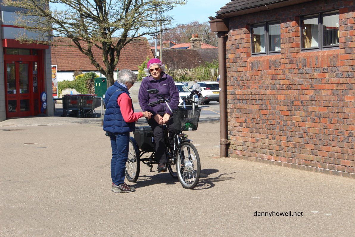 Two ladies, one on a tricycle, having a chat outside Warminster Library.