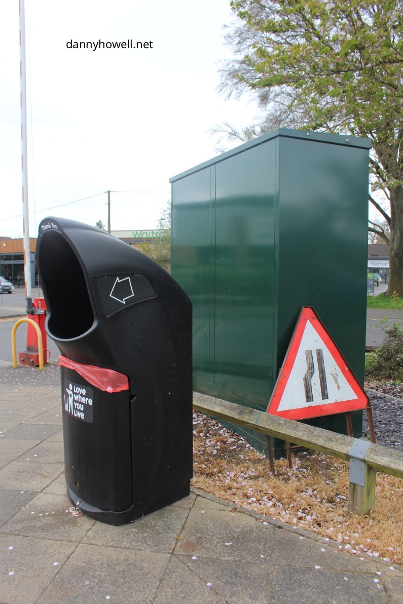 A litter bin at the entrance to the car park of the Castlemore Retail Park, Fairfield Road, Warminster.