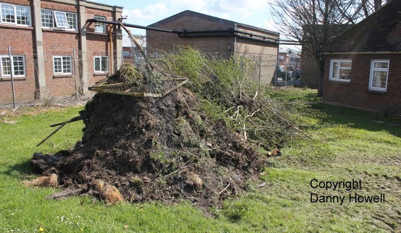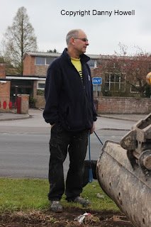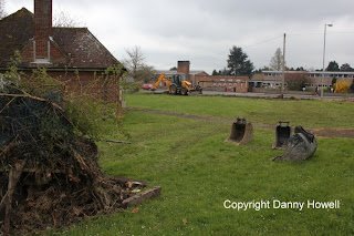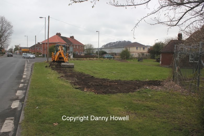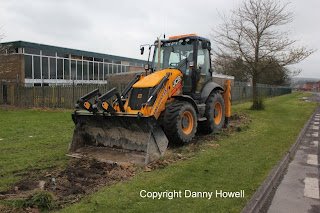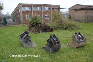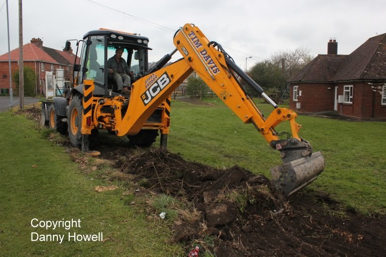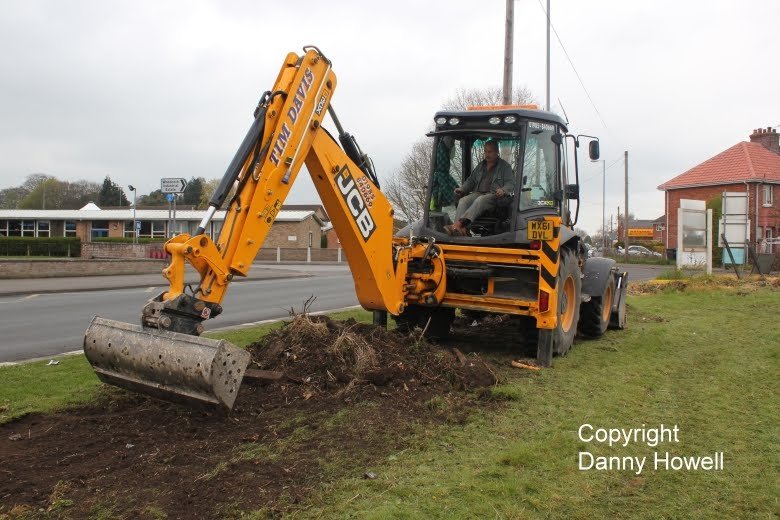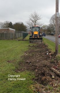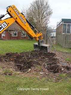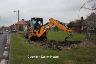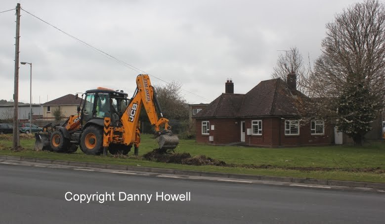 Danny Howell went along with his camera on the morning of Saturday 14th April 2012, to see Tim Davis use a JCB to remove the old wire mesh fence (which was sadly much the worse for wear) from around the frontage of the property.