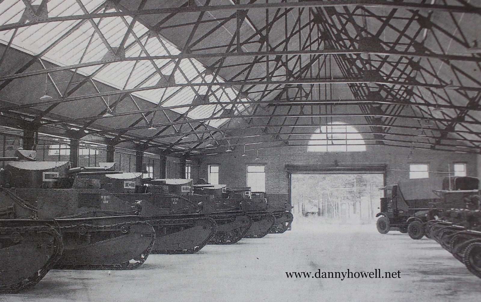 Inside a hangar at Warminster Tank Barracks,