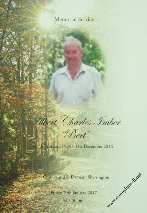 A memorial service was held at the Church of St. Cosmas and St. Damian, Sherrington, on Friday 20th January 2017, for the late Albert Charles Imber (Bert Imber), of Sherrington (latterly at The Wingfield Care Home, Trowbridge), who passed away on Saturday 31st December 2016.