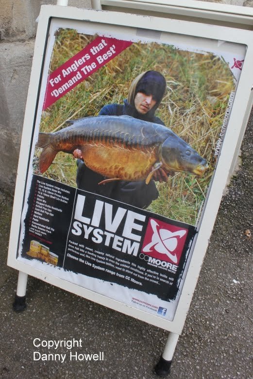 An A-board advertising C.C. Moore’s Live System bait for anglers, outside J. & K. Burton,