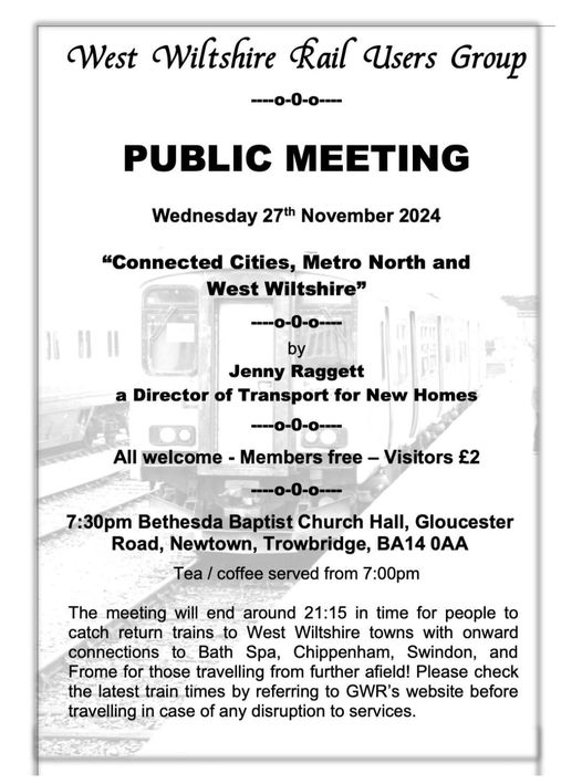 On Wednesday 27th November at 19:30 (arrive from 19:00) at the Bethesda Church Hall, Newtown, Trowbridge, BA14 0AA, Jenny Raggett – a director of Transport for New Homes, will talk through the transport issues in North and West Wiltshire, where we are becoming a “connected city”, and mass transit into Bath and Bristol which, from our sector of the county, many of the jobs are based.