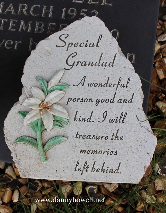 A stone inscribed: “Special Grandad. A wonderful person good and kind. I will treasure the memories left behind.”