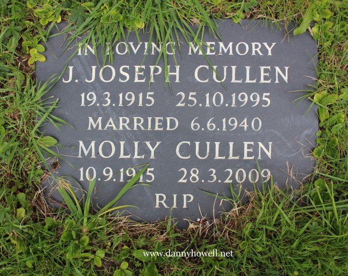 Flat stone in St. Aldhelm’s Churchyard, Bishopstrow, for interred ashes. The wording reads: “In loving memory J. Joseph Cullen 19.3.1915   25.10.1995 Married 6.6.1940 Molly Cullen 10.9.1915   28.3.2009 RIP”. Photograph taken by Danny Howell on Monday 18th April 2016.