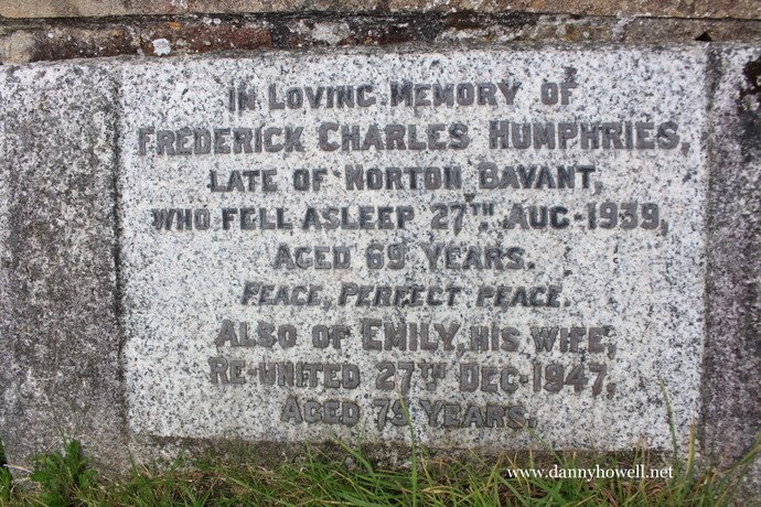 “In loving memory of Frederick Charles Humphries, late of Norton Bavant, who fell asleep 27th Aug 1939, aged 69 years. Peace, Perfect Peace. Also of Emily, his wife, re-united 27th Dec 1947, aged 75 years.”