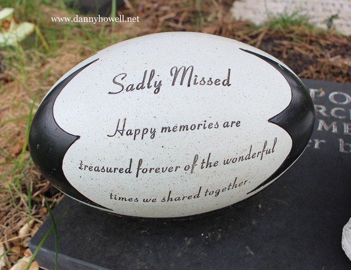 A rugby ball ornament inscribed: “Sadly Missed. Happy memories are treasured forever of the wonderful times we shared together.”