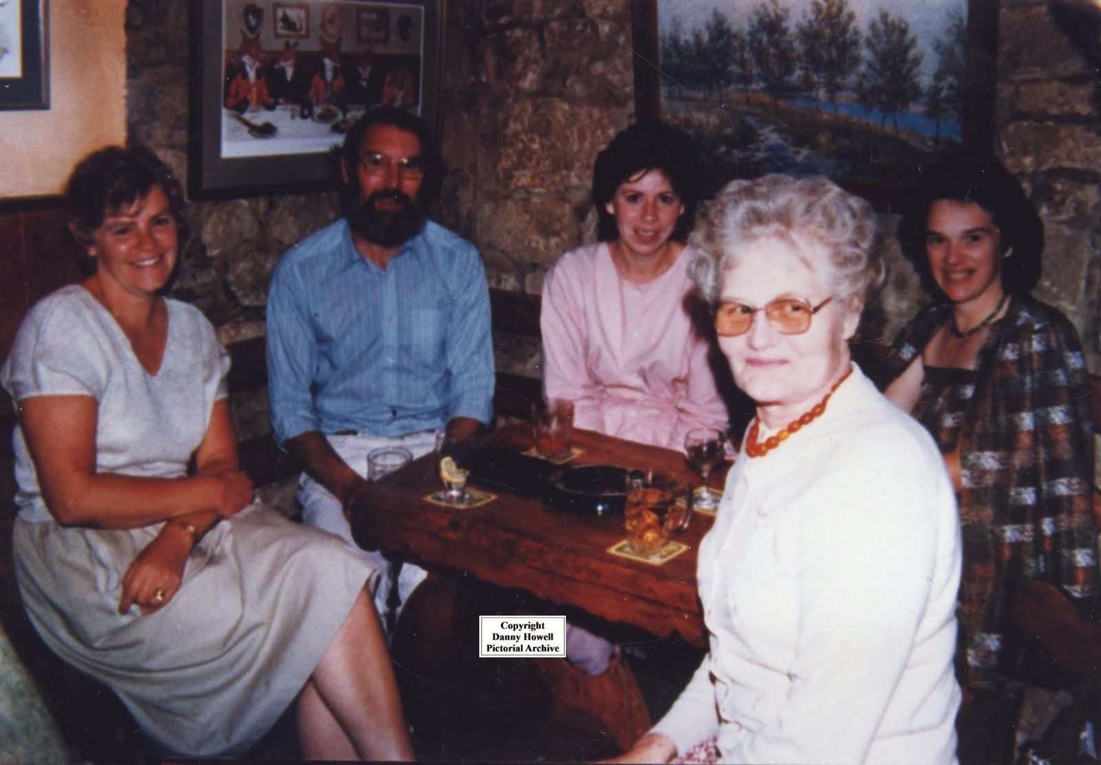 having a drink at the Fox And Hounds on the Green at East Knoyle, in July 1984. They are, left to right: Margaret Aven, Geoff Hall, Lynette Hall, Maureen Dobson, and Suzanne Wiltshire.